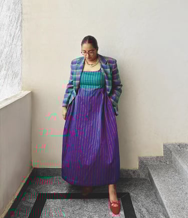 Aiswarya Kutty had a similar revelation when the pandemic led to the closure of her fashion business. As she dealt with significant personal shifts, including weight gain, she began documenting her style evolution online—not for validation, but to rediscover her creative spark. Initially camera-shy, Aiswarya slowly found confidence by embracing her current self. What started as a personal project soon transformed into a thriving business. Her handmade accessories, particularly her unique textile bibs, became a hit. “They elevate an outfit without adding bulk,” she says. She now supports local brands like Nicobar, Doodlage, and NorBlack NorWhite, investing in high-quality, long-lasting fashion.